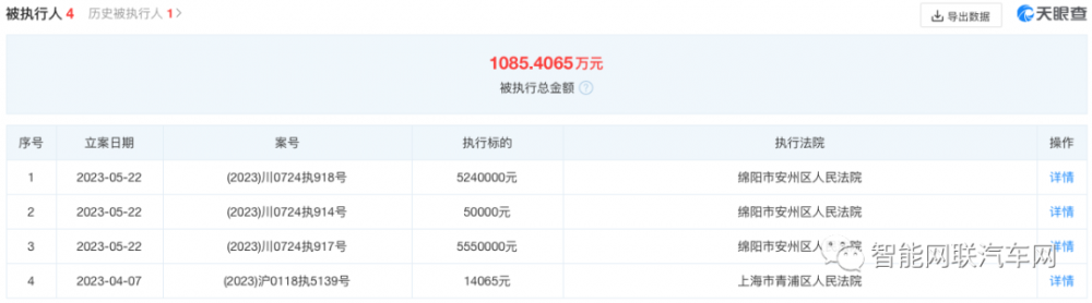 天眼查信息显示,5月22日,威马汽车科技集团有限公司及其子公司威马汽车科技(四川)有限公司新增三则被执行人信息,执行标的合计1084万元,执行法院均为绵阳市安州区人民法院。