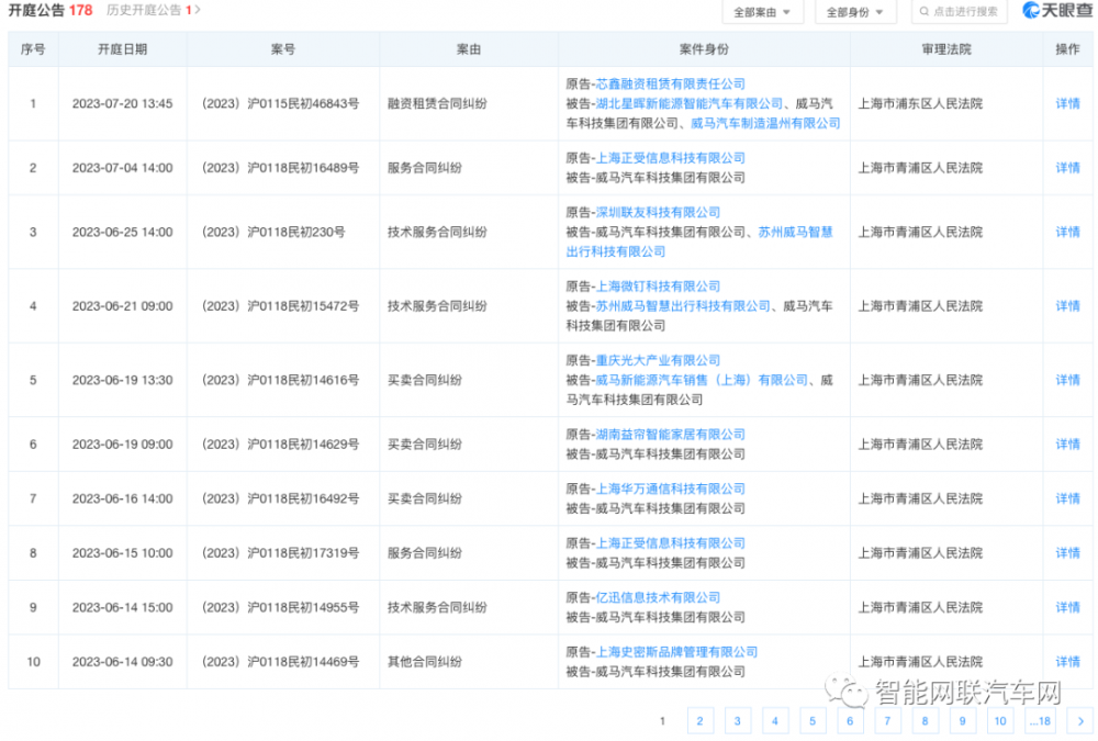 截至发稿前,威马汽车科技集团有限公司面临多起官司,被执行人为4条,被执行总金额为1085.4065万元,开庭公告为178条,其中开庭时间在2023年5月1日至7月20日为55条,案由多为融资租赁合同纠纷、服务/买卖合同纠纷,法律诉讼92条,法院公告15条,司法协助5条。