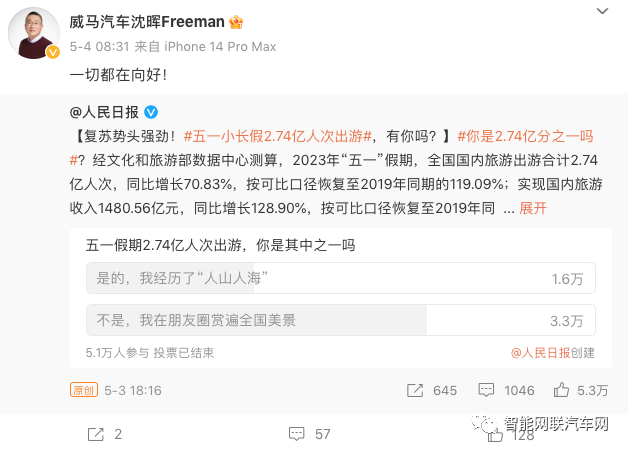 但尽管如此,作为威马汽车董事长的沈晖则是向外界释放好消息,沈晖表示:“威马只要还有一口气,还是可以继续应战的。目前最大的挑战,是黎明前的黑暗怎么度过。”5月4日,沈晖在个人社交媒体平台表示:“一切都在向好!”5月6日,威马在官方微博表示:“具备整车OTA自研能力的厂商不多,威马是为数不多具备此能力的品牌之一。”