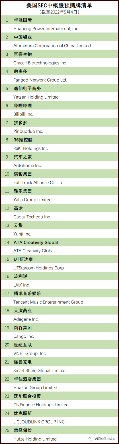 2022年5月4日,美国证券交易监督委员会(SEC)将88家中概股纳入“预摘牌”名单(完全名单见文后),名单内新增的中概股公司包括华能国际、中国铝业、哔哩哔哩、拼多多、36氪、腾讯音乐、携程、小鹏汽车、京东、中国移动、网易、蔚来、中国石油、科兴生物、东方航空、南方航空等公司。针对“预摘牌”原因,SEC给出的解释是“无法检查这些公司的审计底稿”,并要求这些公司在5月25日前提交申辩。