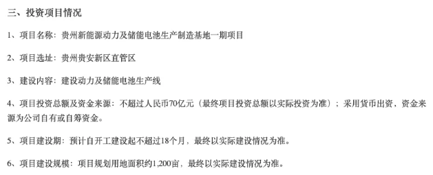 此外,宁德时代11月5日公告称,公司拟在贵州省贵安新区投资建设贵州新能源动力及储能电池生产制造基地一期项目,项目总投资不超过人民币70亿元。