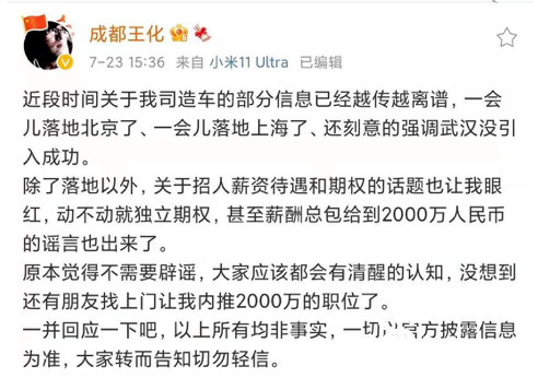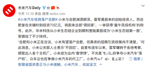 对此小米回应称:“一切以官方披露信息为准”,此外还附上之前小米公关部总经理王化对近期传闻的辟谣微博。结合7月23日小米公关部总经理王化的辟谣来看,目前小米造车似乎还未确定合作厂商。王化曾在微博上公开表示:近段时间关于我司造车的部分信息已经越传越离谱,一会儿落地北京了、一会儿落地上海了、还刻意的强调武汉没引入成功。对于选择江淮汽车代工的说法,江淮汽车对财经网汽车表示,这个事目前不清楚,我们是上市公司,信息要以上市公司的公告为准。