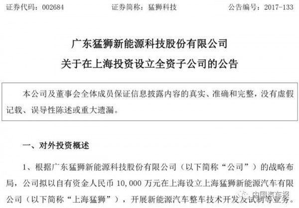 他告诉记者,上海猛狮的成立是为了充分整合目前公司新能源汽车事业部下属各子公司的业务团队、生产条件、技术积累等资源,为未来公司申请新能源汽车整车生产资质,降低公司整车生产、销售成本,提高公司盈利能力做好准备。