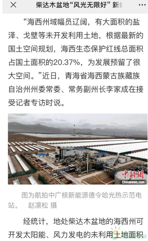 4月23日,媒体刊发《柴达木盆地“风光无限好” 新能源供给体系正在形成》,中国广核新能源控股有限公司(简称“中广核新能源”)德令哈分公司助力当地生态环境改善、绿色低碳价值创造。