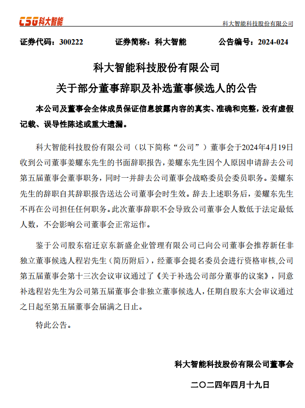 国际能源网获悉,近日,科大智能公告称,公司董事姜耀东因个人原因申请辞去公司第五届董事会董事职务,同时一并辞去公司董事会战略委员会委员职务。姜耀东的辞职自其辞职报告送达公司董事会时生效,辞职后不再在公司担任任何职务。此次董事辞职不会导致公司董事会人数低于法定最低人数,不会影响公司董事会正常运作。