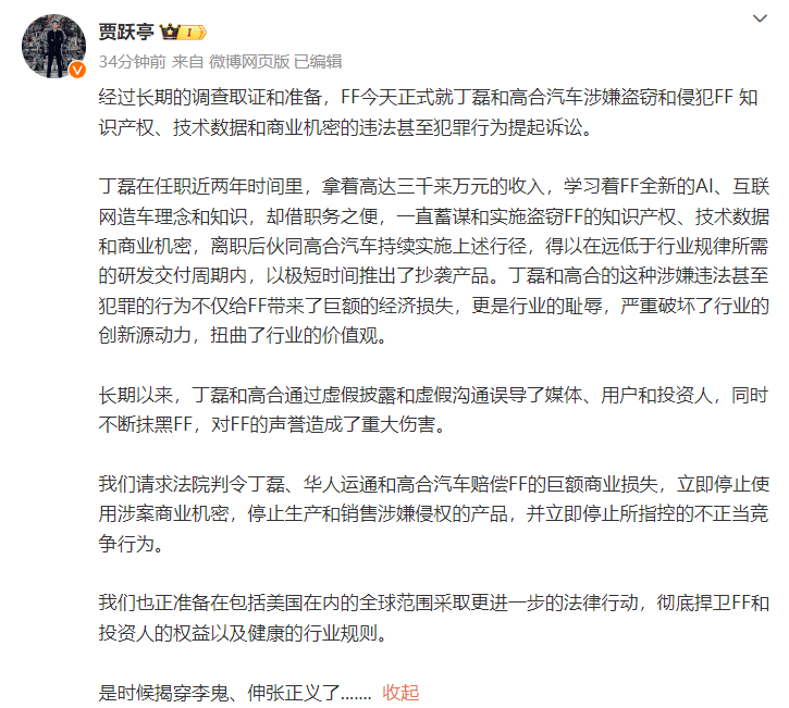 此前,贾跃亭表示,丁磊在任职近两年时间里,拿着高达三千来万元的收入,学习着FF全新的AI、互联网造车理念和知识,却借职务之便,一直蓄谋和实施盗窃FF的知识产权、技术数据和商业机密,离职后伙同高合汽车持续实施上述行径,得以在远低于行业规律所需的研发交付周期内,以极短时间推出了抄袭产品。