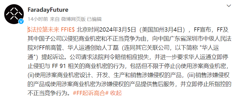 3月5日,法拉第未来也发布公告称,FF及其中国子公司以侵犯商业秘密和不正当竞争为由,向中国广东省深圳市中级人民法院对FF前高管、华人运通创始人丁磊提起诉讼。