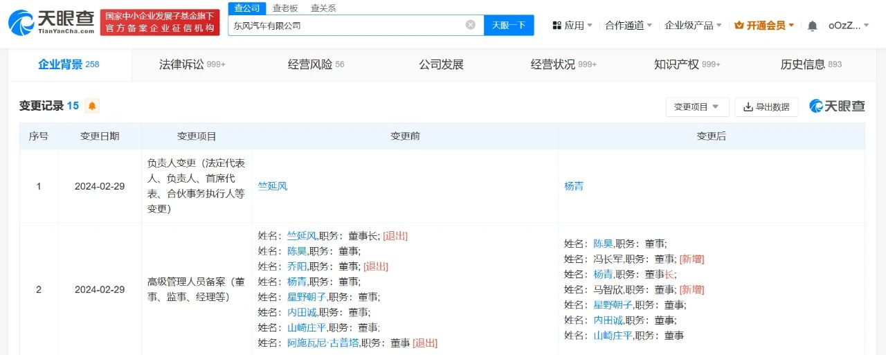 国际能源网获悉,天眼查App显示,2月29日,东风汽车有限公司发生工商变更,竺延风卸任法定代表人、董事长,由杨青接任,同时公司多位主要人员也发生变更。
