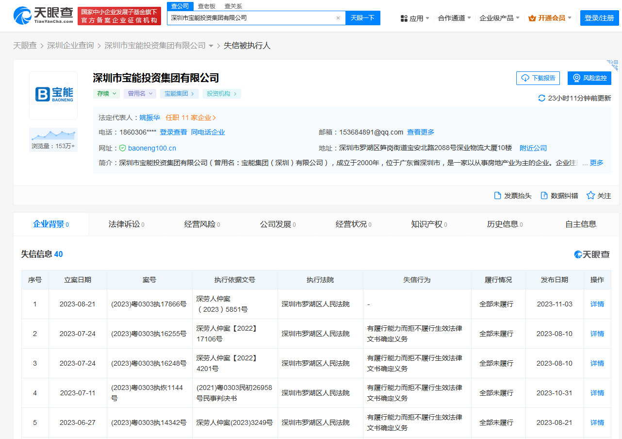 国际能源网1月10日,天眼查显示,姚振华、深圳市宝能投资集团有限公司及旗下深圳市宝能汽车有限公司、广州宝能文化娱乐有限公司等新增一则被执行人信息,执行标的19亿余元,关联案件为合同纠纷,执行法院为广州市中级人民法院。风险信息显示,目前,深圳市宝能投资集团有限公司存在62条被执行人信息,被执行总金额超375亿元。