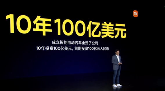 据悉,小米汽车将10年投资100亿美元,首期投资100亿元人民币。