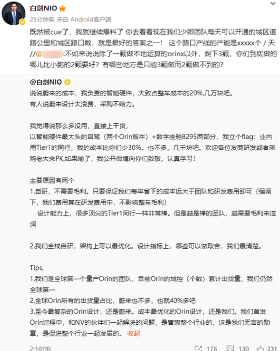 今日,蔚来副总裁、微博认证用户“白剑NIO”在线分享了蔚来的成本相关内容,其表示: