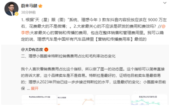 据悉,李想此前转发汽车博主微博时表示:大家最关心的营销和传播的费用,包含在整体销售和管理费用里。我可以确定地说,理想汽车是中国所有汽车品牌里“营销和传播费用率”最低的。不过,蔚来马麟似乎并不认同,他转发李想微博表示,根据“天(星)眼(图)”系统,理想今年3款车在抖音平台的内容投放应该在9000万元左右,花费最大的不是微博平台。此外,马麟还反问李想:大家最关心的不应该是研发的费用和费效吗?