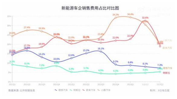 12月6日,有汽车博主做了一张理想、小鹏、蔚来、特斯拉的“销售费用占比”动态图。该博主认为,这个指标可以简单直接的反映车企卖车是否容易,数据高就表明卖车越不容易。在图中,特斯拉是四个车企中数据最低的,证明特斯拉目前卖车是最容易的。理想从2023年开始已经一步步接近特斯拉的水平。该博主表示,“这是最好的变化”。