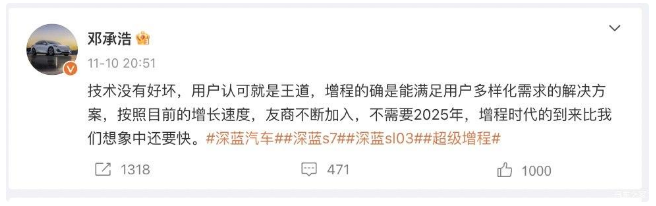 不过,也有人支持增程模式,长安深蓝汽车 CEO 邓承浩就表示:技术没有好坏,用户认可就是王道,增程的确是能满足用户多样化需求的解决方案,按照目前的增长速度,友商不断加入,不需要 2025 年,增程时代的到来比我们想象中还要快。