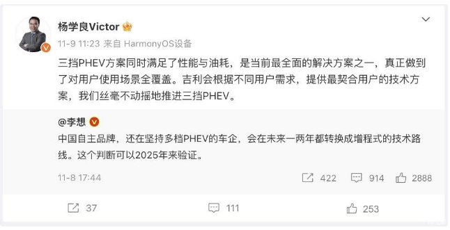 另一位被点名的吉利控股集团高级副总裁杨学良也在隔天进行了回应,称将“丝毫不动摇地推进三挡 PHEV。”