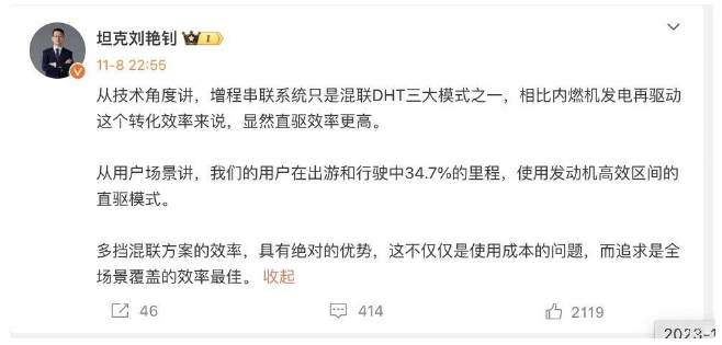 当时刘艳钊就曾回应不会转向增程,他认为,从技术角度讲,增程串联系统只是混联 DHT 三大模式之一,相比内燃机发电再驱动这个转化效率来说,显然直驱效率更高,“从用户场景讲,我们的用户在出游和行驶中 34.7% 的里程,使用发动机高效区间的直驱模式。多挡混联方案的效率,具有绝对的优势,这不仅仅是使用成本的问题,而追求是全场景覆盖的效率最佳。”
