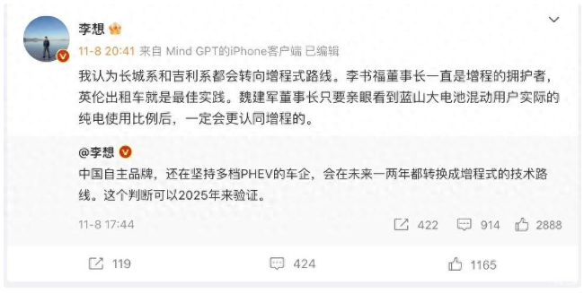 IT之家注意到,这并不是刘艳钊首次公开表示不会使用增程模式。此前,理想车 CEO 李想在微博表示:中国自主品牌,还在坚持多挡 PHEV 的车企,会在未来一两年都转换成增程式的技术路线,这个判断可以到 2025 年来验证。他还直接点名了长城和吉利,表示它们都会转向增程。