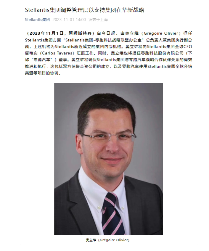 11月1日,欧洲汽车巨头Stellantis集团发布公告,自今日起,由奥立维(GrégoireOlivier)担任Stellantis集团方面“Stellantis集团-零跑科技战略联盟办公室”总负责人兼集团执行副总裁,上述机构为Stellantis新近成立的集团内部机构。