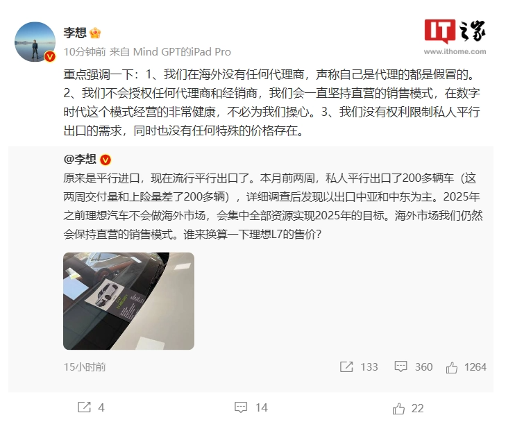 李想称,理想汽车不会授权任何代理商和经销商,并且会“一直坚持直营的销售模式”,在数字时代这个模式经营得非常健康。对于部分理想汽车被“私人平行出口”,李想表示官方对此没有任何限制,同时也没有任何“特殊的价格”存在。