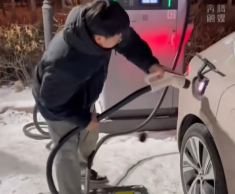 视频中,充电桩充电线缆被冻得梆硬,根本掰不动,他最后用尽全身力量连掰带拉,才将充电枪插入充电口,过程相当艰难。