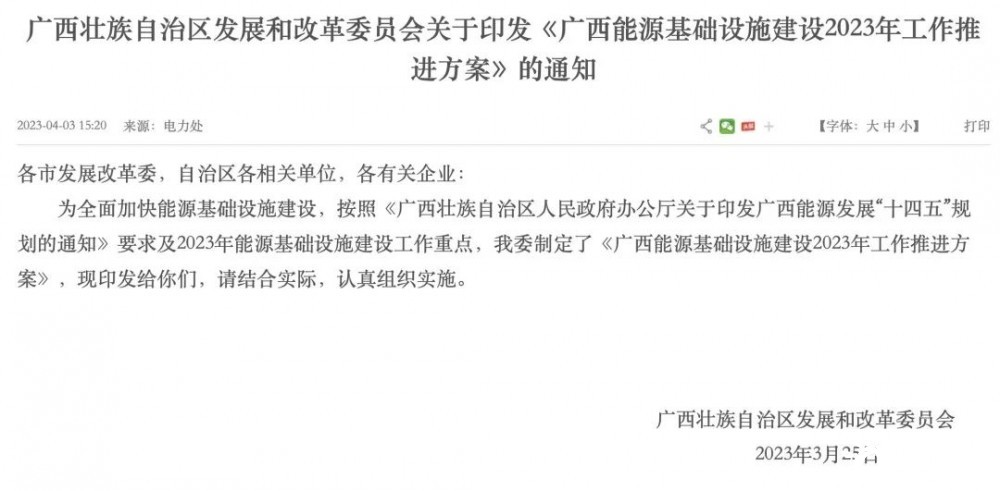近日,广西壮族自治区发展和改革委印发《广西能源基础设施建设2023年工作推进方案》(以下简称方案)。据悉,2023年围绕广西“十四五”能源发展规划实施,以输配电、核电、火电及煤电机组灵活性改造、储能、光伏发电、风电、水电、油气及煤炭储运、充电基础设施和综合供能服务站等建设为重点,统筹推进输配电、电源、储能、油气及煤炭储运、充电设施等五大类项目建设,确保完成年度投资750亿元。