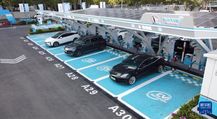 当日,一座超级充换电综合能源站——安徽石油大众综合能源站在安徽省合肥市投入运营。该站集加油、充电、换电、光伏、储能等功能为一体,设充电车位142个,充电车棚可作为光伏发电站,年发电量约22万千瓦时,年减排二氧化碳219吨。 新华社记者 周牧 摄