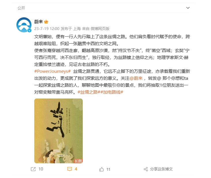 7月19日午间,蔚来汽车官宣“Power Journeys 丝绸之路”贯通。