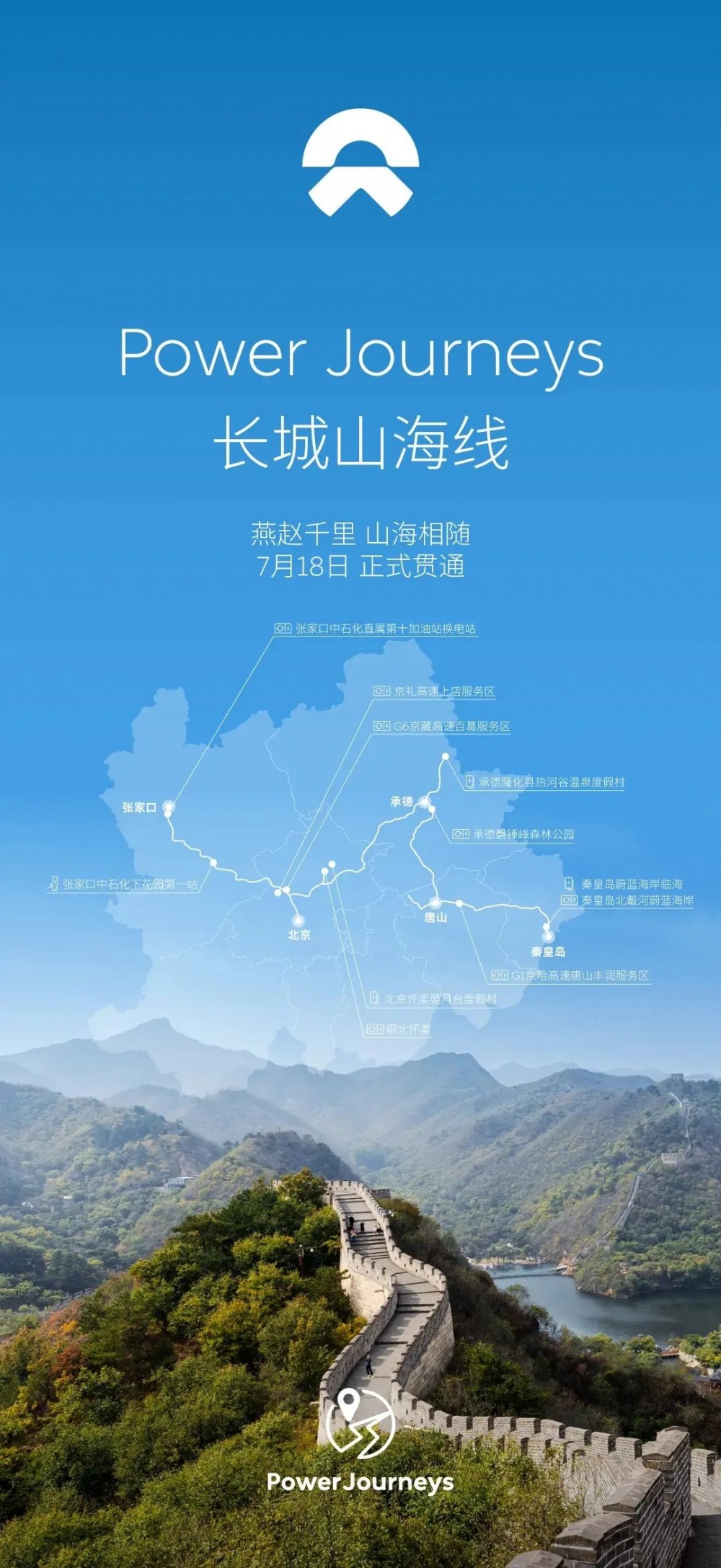 7月19日消息,蔚来汽车近日宣布“PowerJourneys丨长城山海线”正式贯通,连接张家口、北京、承德、唐山、秦皇岛等城市,途经雁栖湖、避暑山庄、清东陵等旅游胜地,最终抵达秦皇岛蔚蓝海岸。