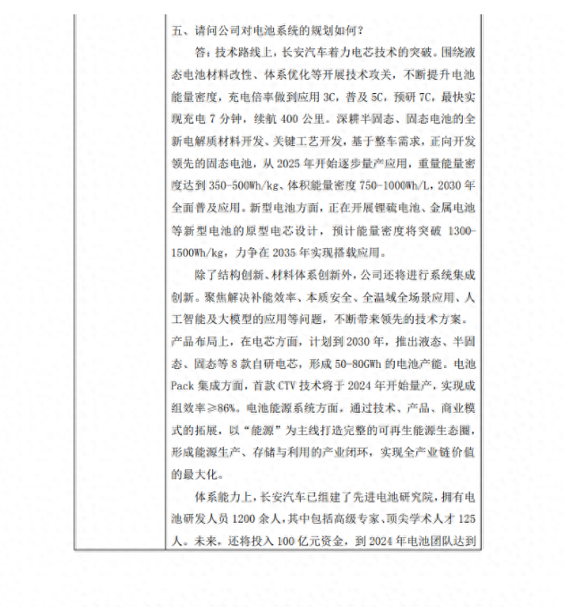 技术路线上,长安汽车着力电芯技术的突破。围绕液态电池材料改性、体系优化等开展技术攻关,不断提升电池能量密度,充电倍率做到应用 3C,普及 5C,预研 7C,最快实现充电 7 分钟,续航 400 公里。