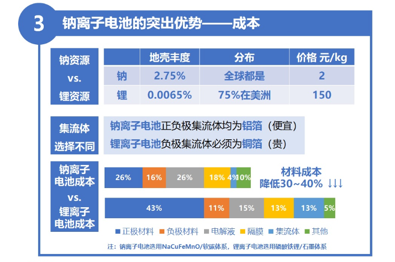 相反的,钠矿在地壳中的储备占比高达2.64%,且在全球分布广泛,原材料供应可靠,低温放电性能优异,安全性高,环保且成本低,能以锂离子电池30%-40%的成本优势达到锂电池70%的性能。