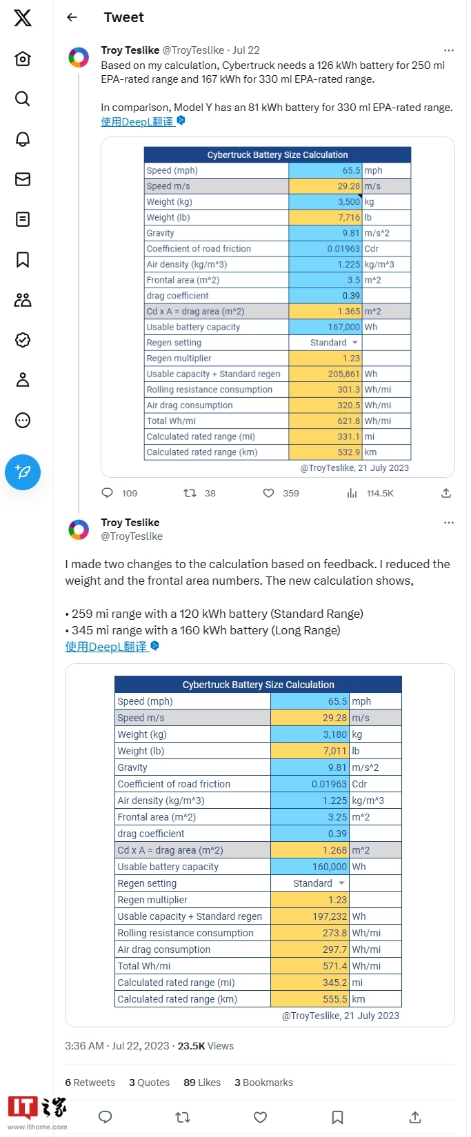 随后,该博主还假设了“23%的能量通过动能回收可被重复使用”的情况,得出结论如下: