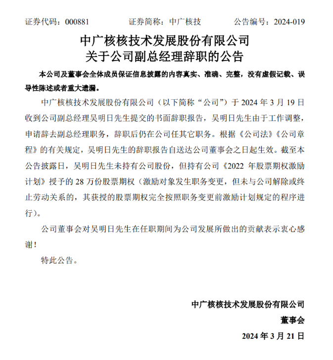 先生由于工作调整,申请辞去副总经理职务,辞职后仍在公司任其它职务。