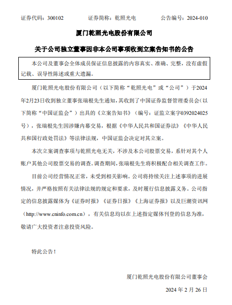 国际能源网获悉,日前,乾照光电发布公告披露,2月23日收到独立董事张瑞根先生通知,其收到了中国证券监督管理委员会(以下简称“中国证监会”)出具的《立案告知书》(编号:证监立案字0392024025号),张瑞根先生因涉嫌内幕交易,根据《中华人民共和国证券法》《中华人民共和国行政处罚法》等法律法规,中国证监会决定对其立案。