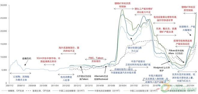 工信部网站发布2021年镍钴锂行业运行情况:2021年,我国新能源产业快速发展,镍钴锂行业整体呈供需两旺格局,产品价格大幅上涨,进口明显增加。2021年电解镍、电解钴现货均价分别为13.7万元/吨、36.3万元/吨,同比上涨25.6%、40.1%;碳酸锂、氢氧化锂现货均价分别为12.2万元/吨、11.3万元/吨,同比上涨177%、117%。截至2月9日,电池碳酸锂市场均价为39万元/吨,较今年年初上涨34.48%,工业级碳酸锂市场均价为37.75万元/吨,较今年年初上涨39.81%。