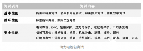 为确保动力电池符合品质要求,生产厂家会在出厂前对电池包进行下线测试。从基本性能,循环性能和安全性能三个方面进行检测。由于电动汽车使用了300V以上高压电气系统,瞬时工作电流可达几百安。电池包作为车内的高压部件,其充放电测试也有高压和大电流的电气要求,测试电压可达1000V,测试电流可达600A以上。