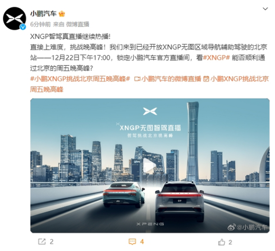 12月21日,小鹏汽车官方宣布,XNGP智能驾驶直播继续热播,此次挑战直接上难度,于已开通XNGP无图区域导航辅助驾驶的北京站,选定12月22日晚,向北京的晚高峰时段发起挑战!