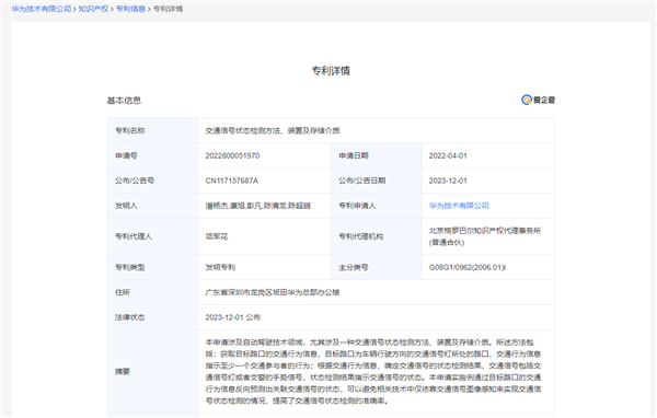 12月1日,从企查查网站获悉,华为技术有限公司申请的“交通信号状态检测方法、装置及存储介质”专利正式公布。