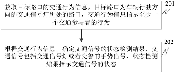 获取目标路口的交通行为信息,目标路口为车辆行驶方向的交通信号灯所处的路口,交通行为信息指示至少一个交通参与者的行为;根据交通行为信息,确定交通信号的状态检测结果,交通信号包括交通信号灯或者交警的手势信号,状态检测结果指示交通信号的状态。