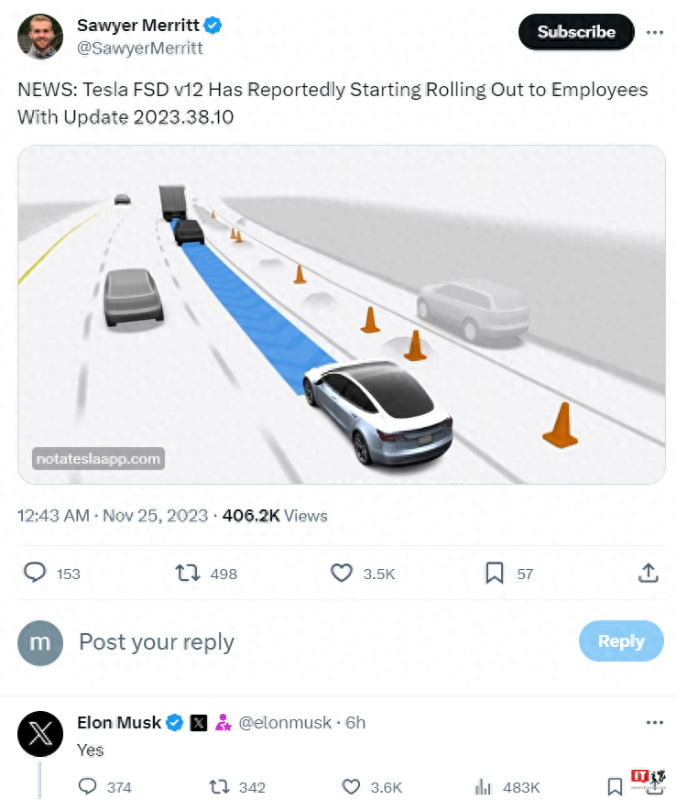 马斯克简单地回应了有关 FSD V12 首次向特斯拉员工推出的报道,在一篇有关此事的帖子中回复“Yes”。