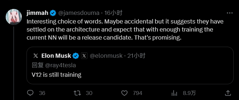 8月31日消息,马斯克昨日在X平台回应一位用户提出的有关特斯拉公司“何时能够正式推出FSDV12版本”时表示,“FSDV12正在训练中,而训练计算很快将不再是一个限制因素。”