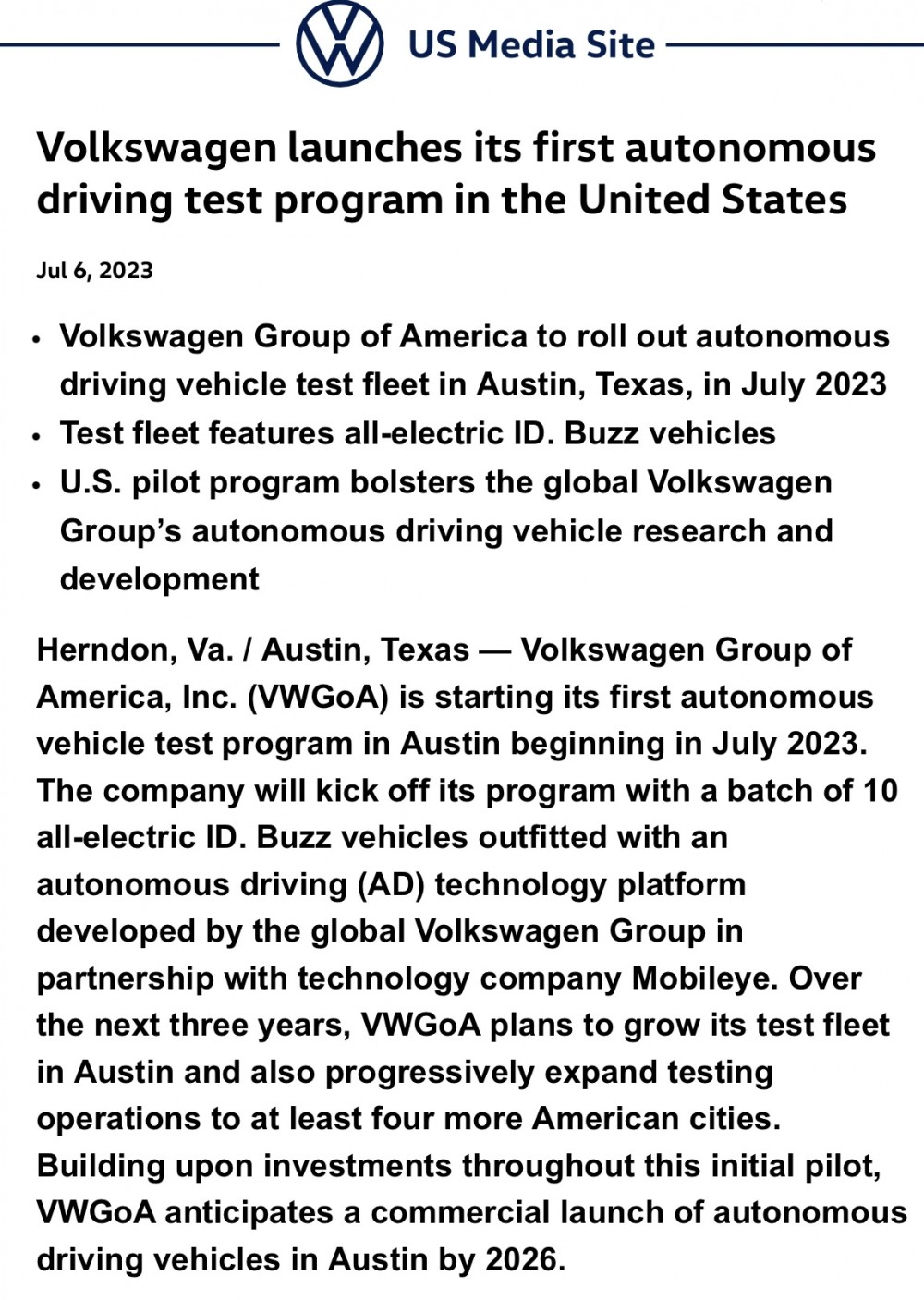 大众当下已经组建了名为VolkswagenGroupofAmerica(VWGoA)的小组主导相关业务,初期将在美国得州奥斯汀部署10辆自动驾驶汽车。大众表示,预计未来3年内,他们会在至少其它3个美国城市部署自动驾驶汽车测试车队,并于2026年推出商用自动驾驶汽车。