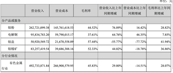 公告显示,寒锐钴业上半年主要产品量价齐升。其中,钴粉实现销售2.63亿元,同比增长76.89%,毛利率达45.52%,同比增长28.82;钴盐实现销售5092万元,毛利率达57.44%;钴精矿实现销售8326万元,同比增长44.02%,毛利率高达52.33%。
