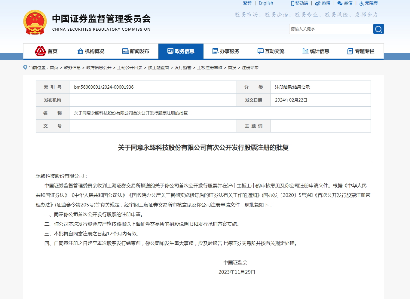 国际能源网获悉,2月22日,中国证监会发布关于同意永臻科技股份有限公司首次公开发行股票注册的批复,同意该公司首次公开发行股票的注册申请。并要求永臻股份本次发行股票应严格按照报送上海证券交易所的招股说明书和发行承销方案实施。该批复自同意注册之日起12个月内有效。自同意注册之日起至本次股票发行结束前,永臻股份如发生重大事项,应及时报告上海证券交易所并按有关规定处理。