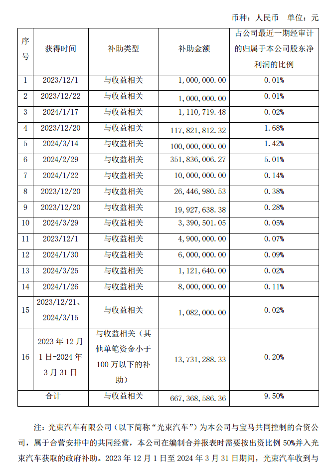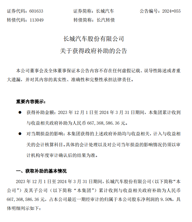 国际能源网获悉,4月29日,长城汽车发布关于获得政府补助的公告。2023年12月1日至2024年3月31日期间,集团累计收到与收益相关政府补助为人民币667,368,586.36元,占本公司最近一期经审计的归属于本公司股东净利润的9.50%。