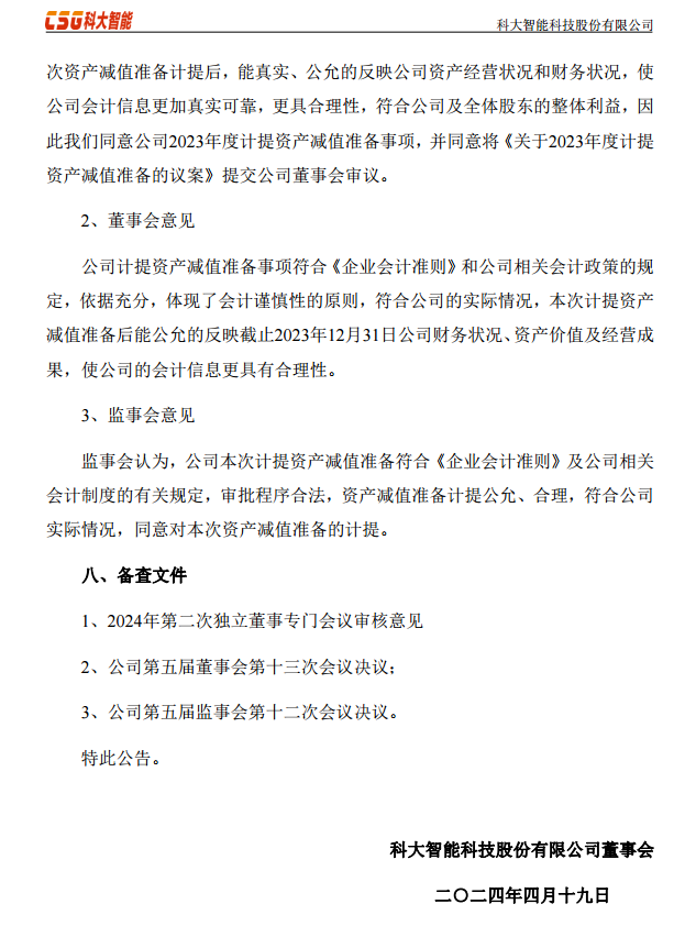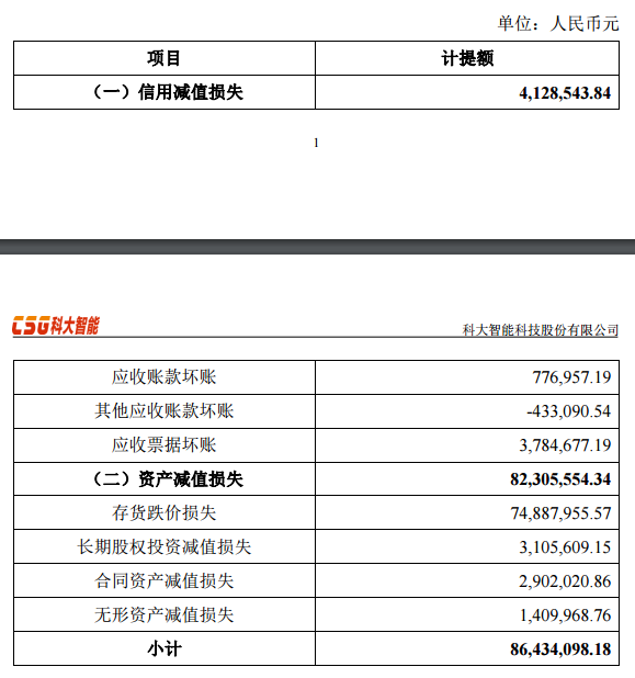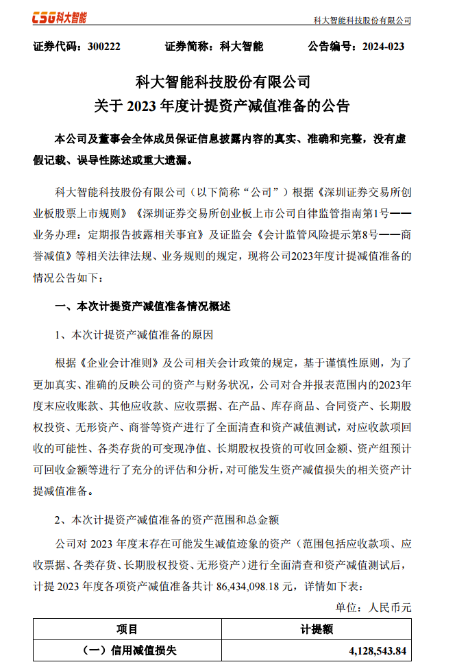 国际能源网获悉,近日,科大智能发布2023年度计提资产减值准备的公告。公司对2023年度末存在可能发生减值迹象的资产(范围包括应收款项、应收票据、各类存货、长期股权投资、无形资产)进行全面清查和资产减值测试后,计提2023年度各项资产减值准备共计86,434,098.18元。