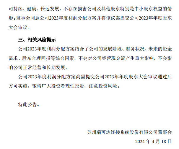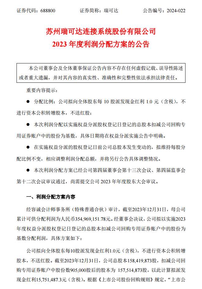 国际能源网获悉,4月17日,瑞可达发布2023年度利润分配方案的公告。