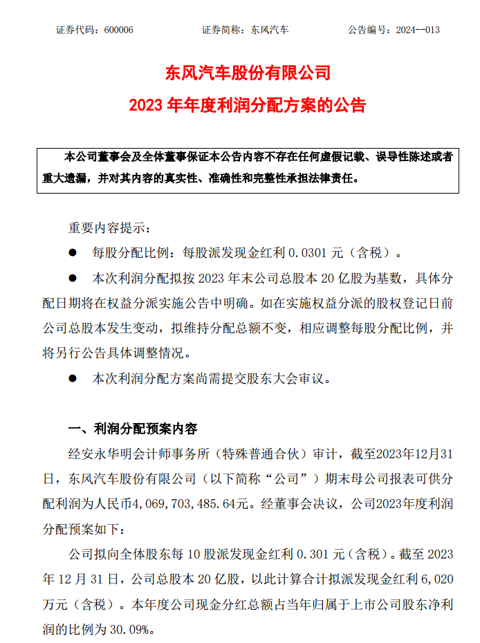 根据公告显示,截至2023年12月31日,东风汽车股份有限公司(以下简称“公司”)期末母公司报表可供分配利润为人民币4,069,703,485.64元。经董事会决议,公司拟向全体股东每 10 股派发现金红利 0.301 元(含税)。截至 2023年 12 月 31 日,公司总股本 20 亿股,以此计算合计拟派发现金红利 6,020万元(含税)。本年度公司现金分红总额占当年归属于上市公司股东净利润的比例为 30.09%。