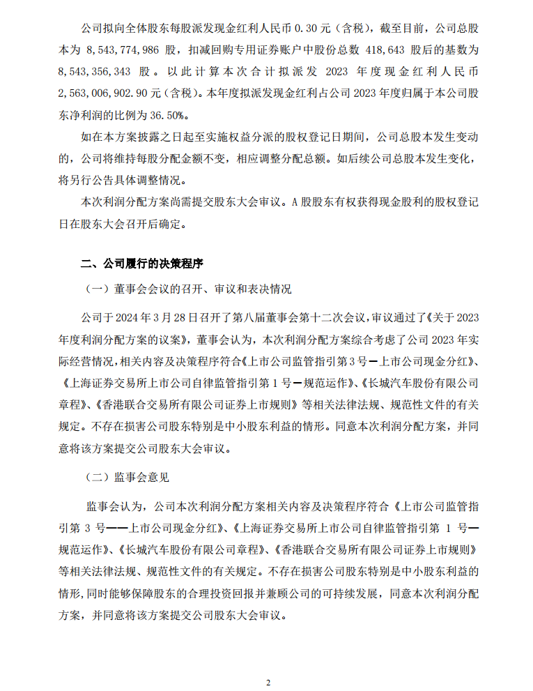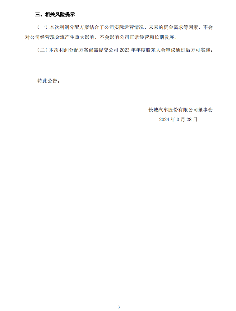 国际能源网获悉,近日,长城汽车发布2023年度利润分配方案公告。