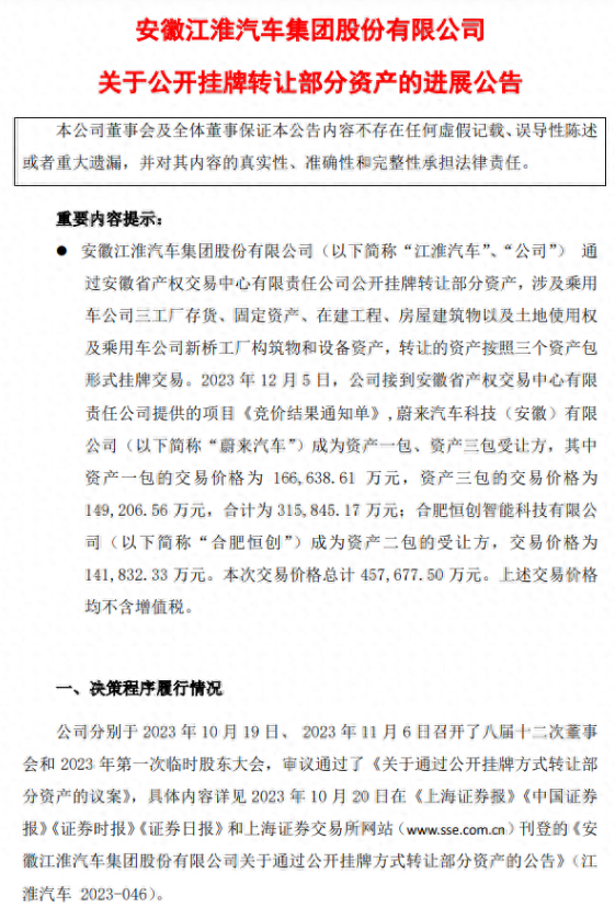 刚刚,江淮汽车发布公告,称公司接到安徽省产权交易中心有限责任公司提供的项目《竞价结果通知单》,蔚来汽车成为资产一包、资产三包受让方,合计交易价格为 31.58 亿元;合肥恒创成为资产二包的受让方,交易价格为 14.18 亿元。