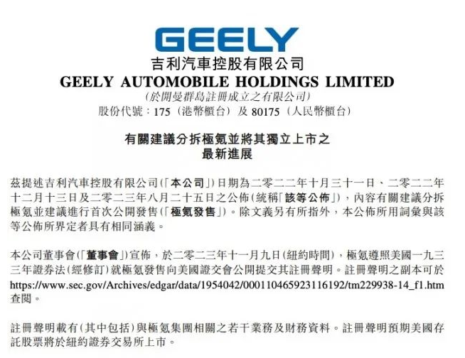 11月10日消息,吉利汽车今日在港交所发布公告,公布了有关建议分拆极氪并将其独立上市的最新进展。